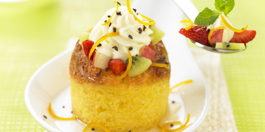 Garnir les bases de Quatre-Quarts pur beurre Ker Cadélac imbibées de fruits et finir par une généreuse rosace de chantilly.
