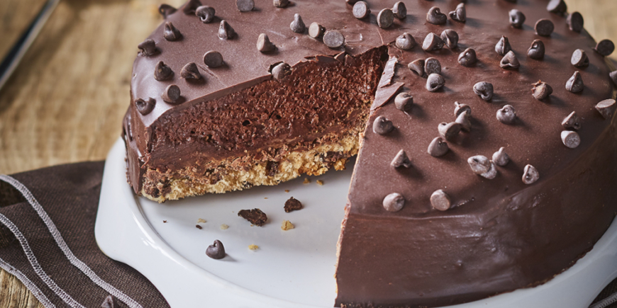 - Faire fondre au bain marie 100 g de chocolat noir pour le glaçage. Le mélanger à 2 cuillères à soupe de crème fraîche. Verser et lisser le chocolat sur le montage, parsemer de pépites de chocoalt et laisser prendre au réfrigérateur au moins 1 heure.