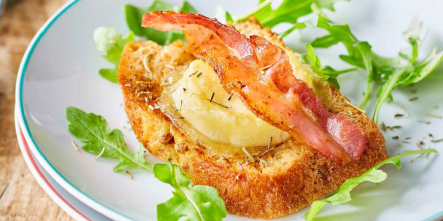 - Disposer une tranche de lard croustillante sur chaque tartine et servir avec une salade de roquette.